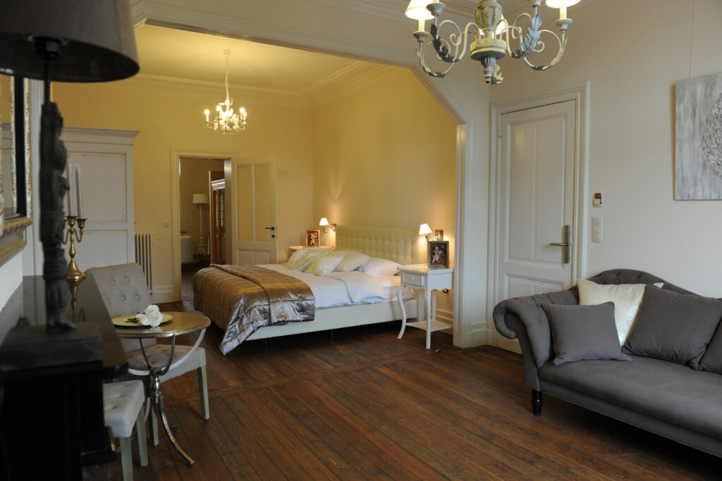 Une des chambres élégantes du Charmehotel Villa Saporis, où chaque détail est soigneusement pensé.