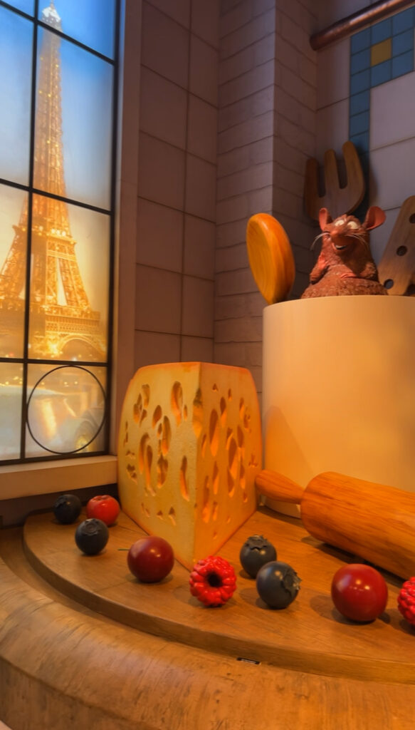 Heureusement, Ratatouille nous rattrape au vol. Se retrouver nez à nez avec des ingrédients géants, comme si nous étions des rats dans la cuisine de Gusteau, c’est un pur moment de plaisir. « Oh il y a ma cousine ! » s’exclame Amani en éclatant de rire devant une énorme tomate, car elle se métamorphose en ce fruit lorsqu’elle rigole. Moi aussi, je me laisse prendre au jeu et je feinte de croquer dans une cerise.