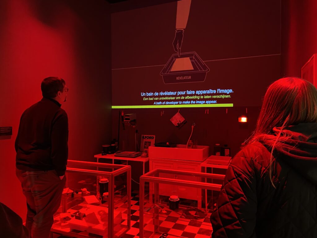 « J’apprécie beaucoup cette mise en scène. En y entrant, la lumière change de teinte et devient rouge comme dans une chambre noire de l’époque ! A mon sens, c’est un réel plus car cela rend « vivant » le processus de développement des photos. Les visiteurs sont nombreux à rester pour toute l’animation projetée et semblent particulièrement intéressés. »