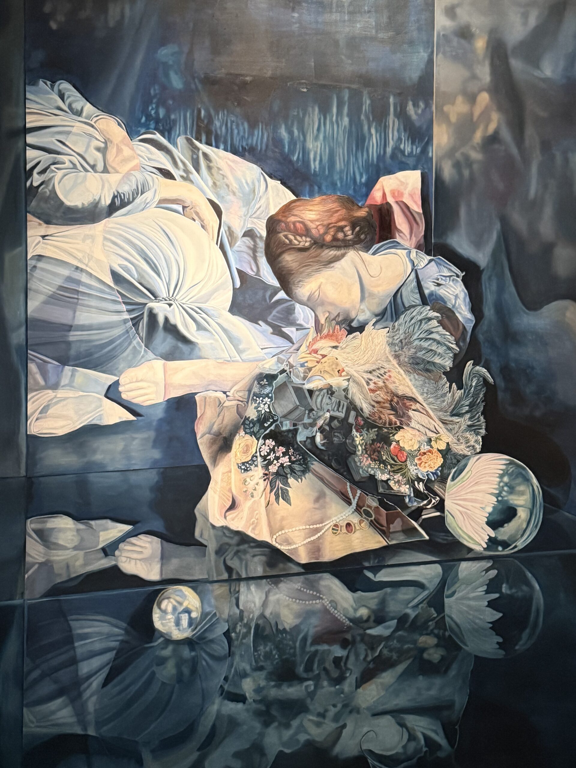 Les couleurs froides et sobres nous apaisent, les détails nous intriguent, les textures nous absorbent. Tout est fait de sorte à ce qu’on passe à un monde nouveau une fois rentré dans le musée. Entre les colonnes, un bleu profond ouvre l’espace. Ce bleu est frais et contraste avec les ors des arches monumentales. Il agit comme une respiration, un courant d’air qui traverse la peau. Les nuages blancs, cotonneux, semblent flotter au-dessus de nous, teintés de couleurs crème et perle, donnant l’impression qu’on peut les toucher. Devant une autre œuvre, Sarah, 24 ans, étudiante venue seule, observe en silence avant de commenter : « Ça me fait ressentir une sorte de gravité tranquille. Ce n’est pas spectaculaire, c’est intérieur. »